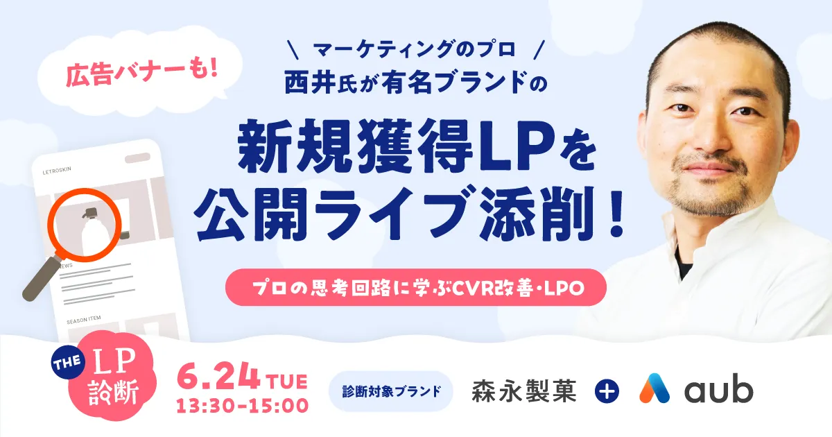 2025年6月24日(火)、森永製菓とAuBが共同でオンラインセミナー「THE LP診断 有名ブランドの新規獲得LPを公開ライブ添削!」を実施します。 本シリーズは、アライドアーキテクツ株式会社が主催し、マーケティングの専門家である株式会社シンクロの代表取締役CEO、西井敏恭氏を講師に迎えます。