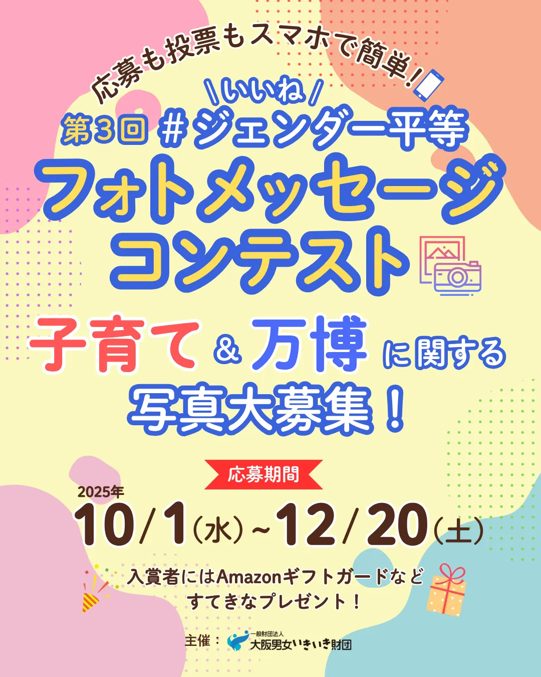 一般財団法人大阪男女いきいき財団が主催するフォトメッセージコンテストが、今年も開催されています。このコンテストでは、ジェンダー平等というテーマのもと、市民が撮影したメッセージ性の高い写真を募集しています。応募はスマートフォンやパソコンから簡単に行え、全国からの応募が可能です。勝者には素敵なプレゼントとしてAmazonギフトカードなどが用意されているため、参加することで楽しい体験が得られるのも魅力です。