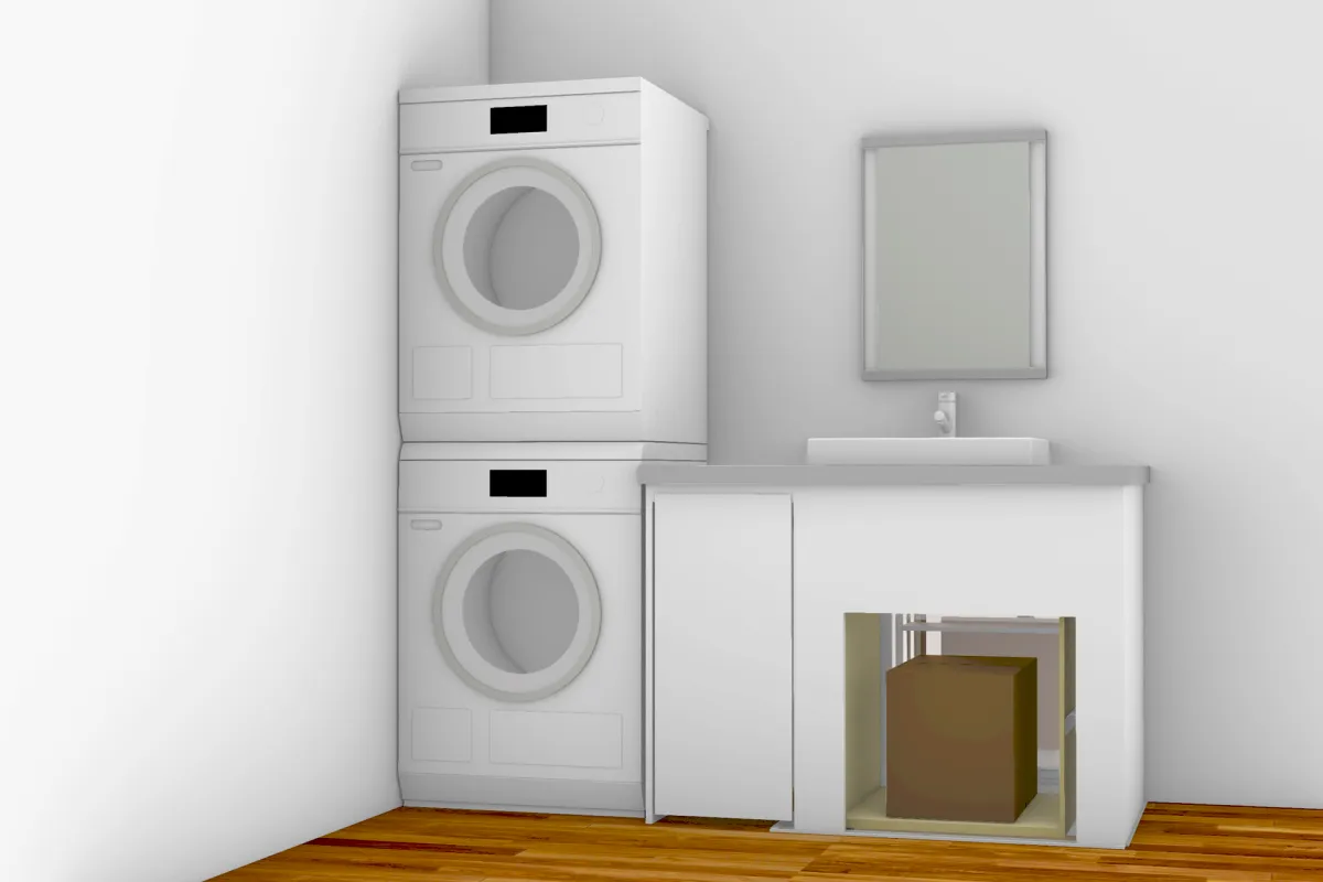 この新しいエレベーターは、一般的な洗面台の下に設えられたキャビネット内に収納された荷物を簡単に取り出すことを可能にします。それによって、限られたスペースを最大限に活用することができ、家全体の収納効率を高めるというメリットがあります。