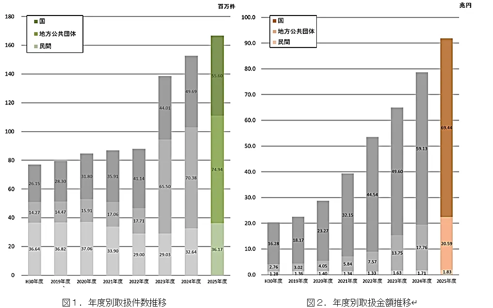 2025年度の利用データを見ると、取扱件数は1億6,671万件で前年度比107.5%、取扱金額も91.8兆円と高い伸びを示しています。特に、国分野での取扱金額が70兆円に迫り、安全かつ確実なキャッシュレス納付手段としての地位を固めています。