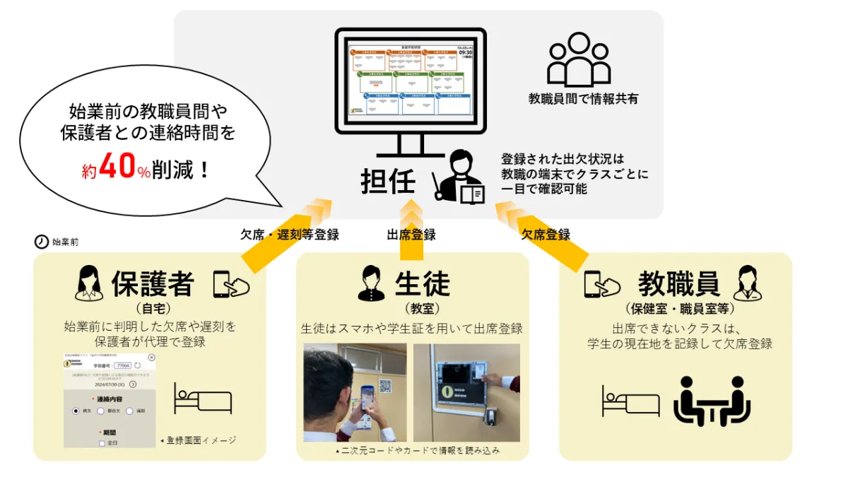 「neconome」は、生徒の出欠状況を一元管理するシステムです。保護者による欠席連絡、学生自身の授業出席記録、教職員による出欠のデータを集約し、専用アプリケーションを通じて校務支援システムに移行・共有します。具体的な手続きとしては、生徒がQRコードを読み取って出席を登録し、スマホを持っていない場合は学生証を使用することで、誰も置き去りにしない設計になっています。