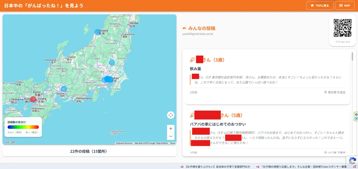 子どもたちの「頑張り」を地図上に可視化し、地域の応援熱をヒートマップで表示します。これにより、「自分だけじゃない」という連帯感が生まれる仕組みです。
