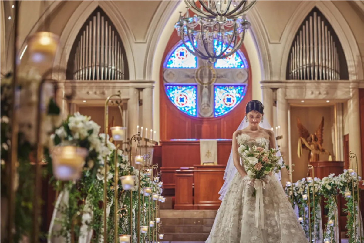 本フェアでは、実際の結婚式を体験しながら検討できる多彩なプログラムが用意されています。大聖堂で行われる模擬挙式や、アフターセレモニーの体験を通じて、式当日の雰囲気をリアルに感じられます。大理石のバージンロードや美しいステンドグラスが印象的な大聖堂では、ゲスト目線での体験が可能です。