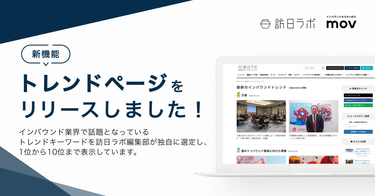 日本のインバウンド業界の重要な情報資源である「訪日ラボ」が、訪日外国人向けの情報を提供するために大幅にリニューアルしました。今回のアップデートによって、新機能として加わった「トレンドページ」が特に注目されています。これはインバウンド業界で話題のトレンドキーワードを毎朝最新情報として配信し、インバウンド担当者や訪日マーケティングに携わる人々にとって、ビジネスに直結する貴重な情報源となるでしょう。