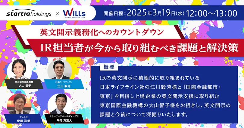 2025年3月19日(水)、スターティアホールディングス株式会社と株式会社ウィルズが共催するウェビナー「英文開示義務化へのカウントダウン:IR担当者が今から取り組むべき課題と解決策」が開催されます。このウェビナーは、東京証券取引所がプライム市場に上場する企業に対して導入する英文開示義務化に関連し、IR担当者向けの重要な情報を提供することを目的としています。