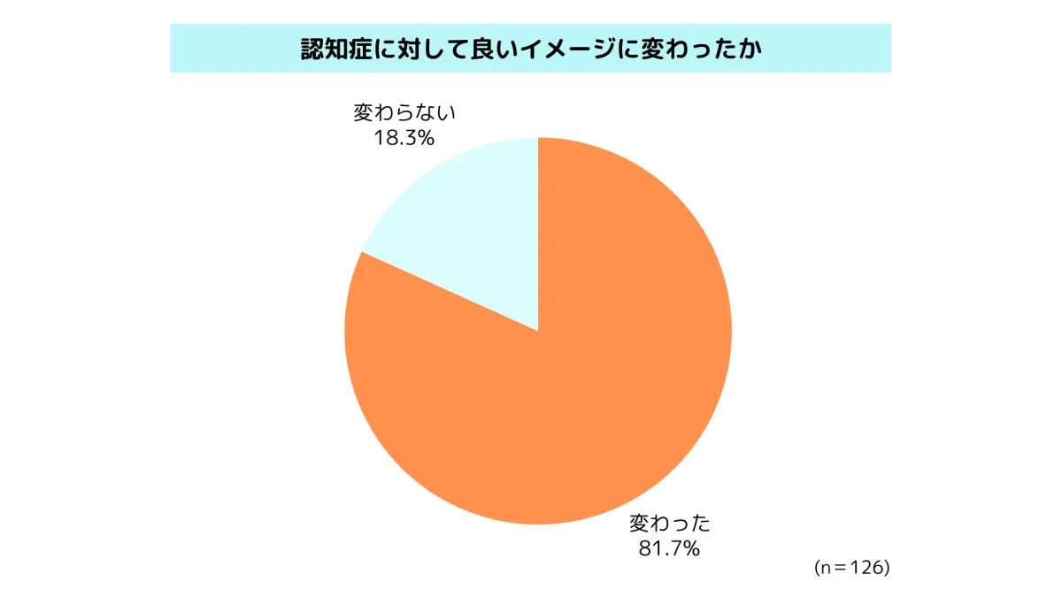 さらに、介護やその仕事に対しても「良い印象に変わった」との回答が71.4%を占めました。特に印象的だったのは、「介護職は認知症の方に希望を与えられる存在である」という新たな視点が得られたことです。