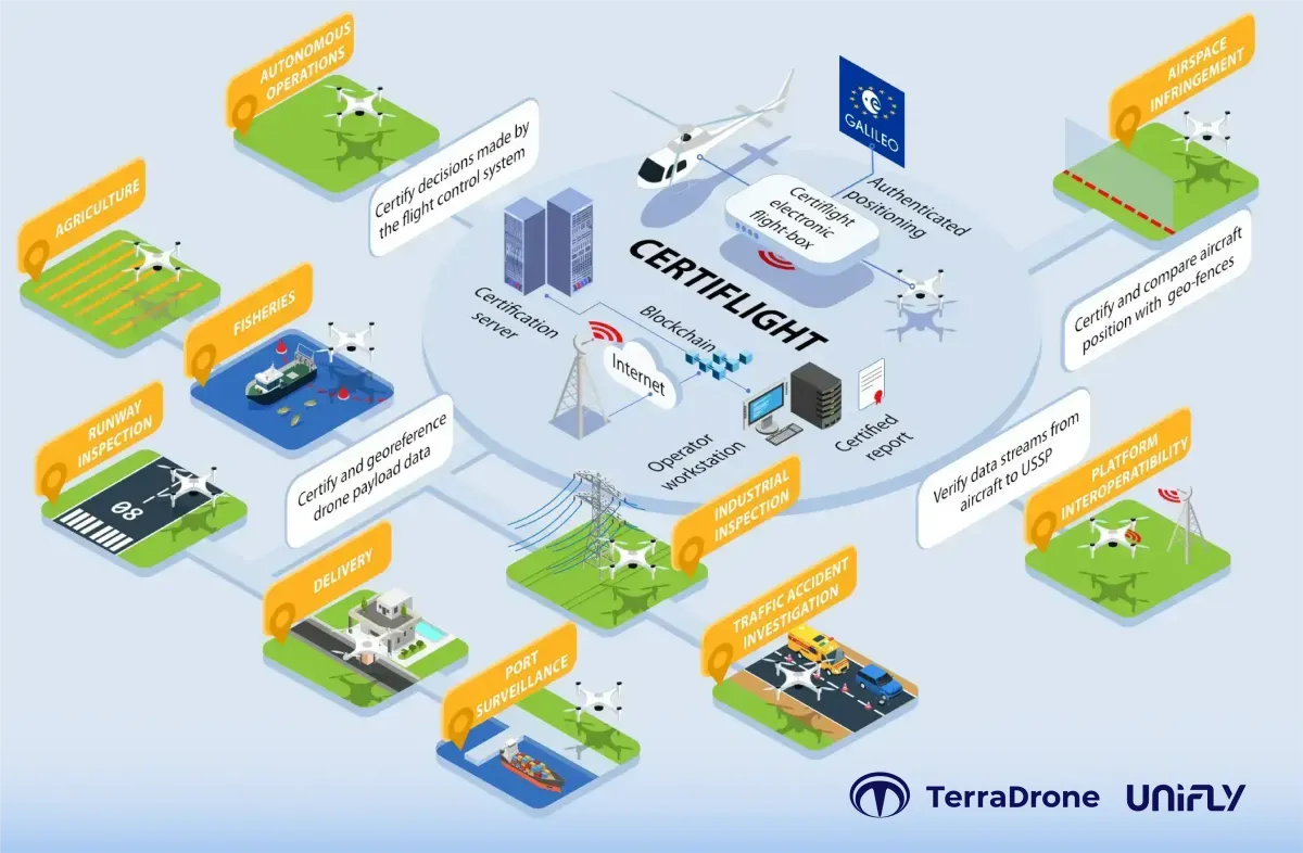 『Certiflight』プロジェクトは、U-space(ユーロの規制枠組み)を活用し、Galileo衛星のOSNMA技術を使って、ドローンや一般航空機の飛行データをブロックチェーンに記録することを目的としています。この取り組みは、飛行データの真正性を保証することに加え、飛行承認の取得を簡素化する施策を含んでいます。