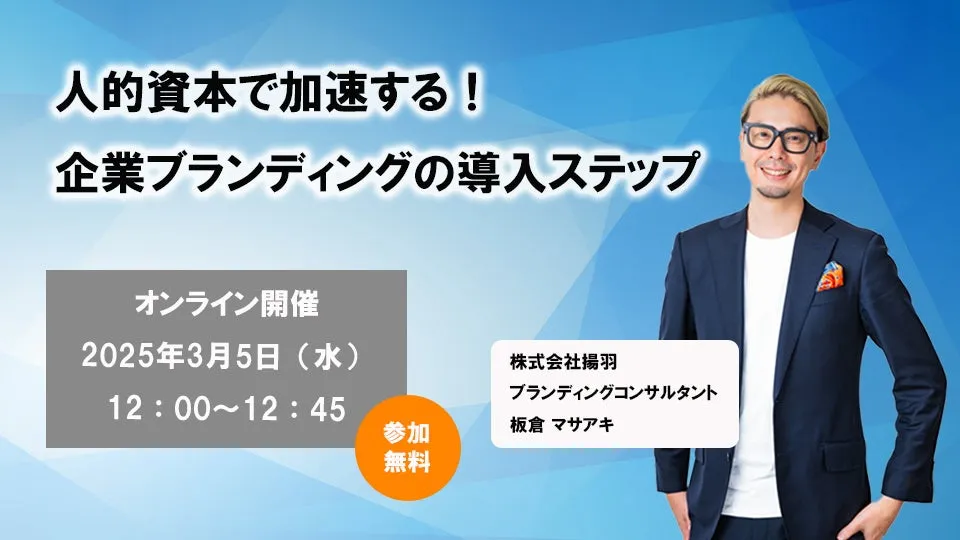 企業の成長と持続可能性が求められる現代において、人的資本経営の重要性はますます増しています。株式会社揚羽は、2025年3月5日(水)に「人的資本で加速する!企業ブランディングの導入ステップ」と題したオンラインセミナーを 실施します。本セミナーでは、経営者、経営企画部門、IR部門、人事担当者向けに、人的資本を基盤とした企業ブランディングの具体的な手法を学べる内容となっています。