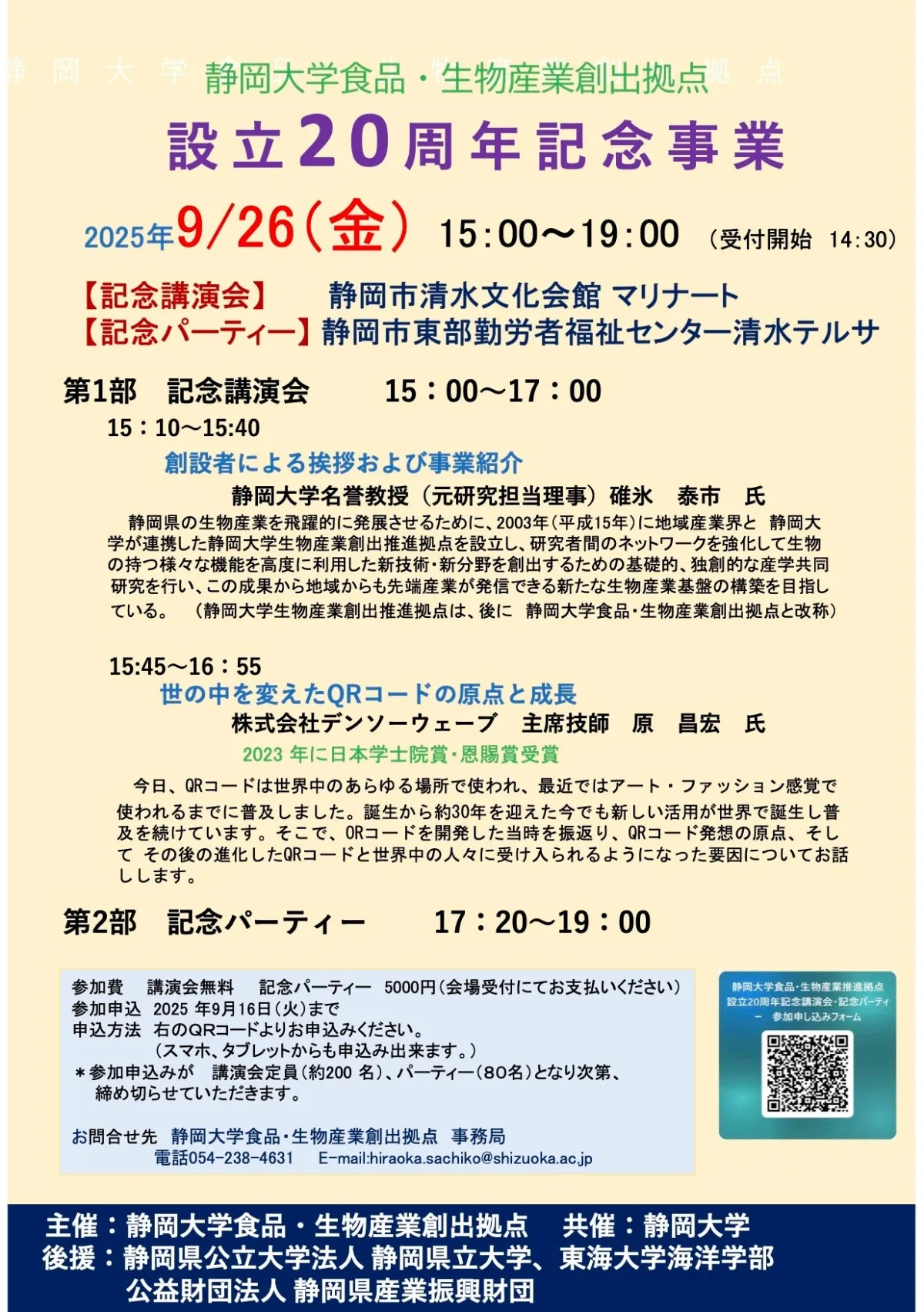 静岡大学食品・生物産業創出拠点 第20周年記念事業のご案内
