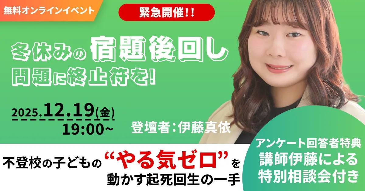 そんな不安を少しでも軽減するため、2025年12月19日(金)に「冬休みの宿題回し問題に終止符を!不登校の子どもの”やる気ゼロ”を動かす起死回生の一手」というテーマの無料オンラインイベントが開催されます。このイベントは、キズキ共育塾が主催し、不登校支援の専門家である伊藤真依さんが登壇します。