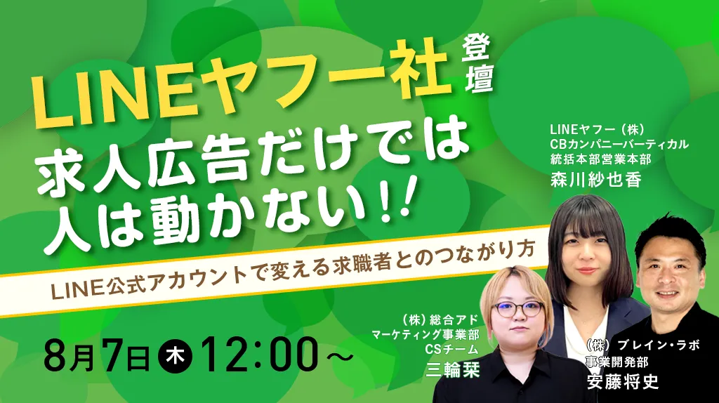 主催は株式会社ブレイン・ラボと株式会社総合アドで、ゲストにはLINEヤフー株式会社を迎え、LINEがなぜ採用や集客において注目されるのか、その理由や他の媒体との差別化、具体的な活用事例を解説します。セミナーはオンラインで行われ、参加は無料です。