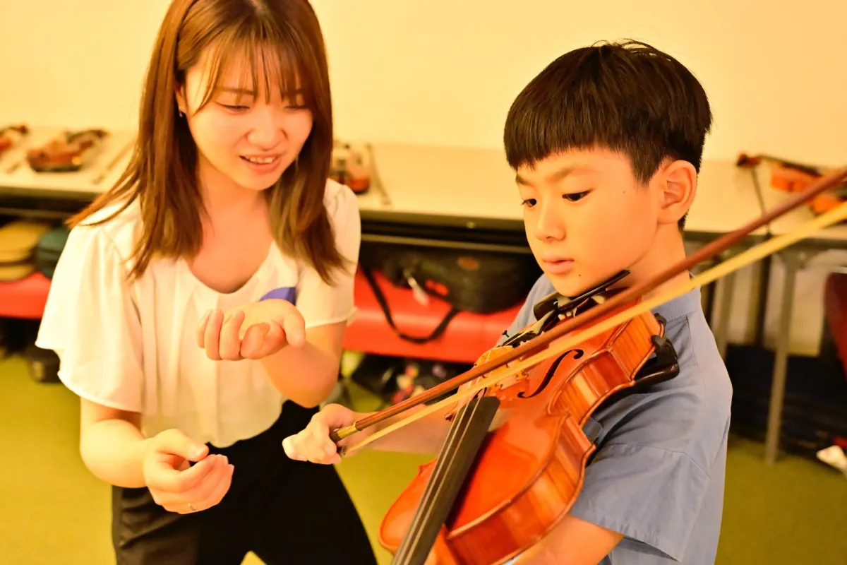 午後の部では、実際に楽器を手に取り音を出す「楽器体験コーナー」が設けられました。打楽器や弦楽器に触れながら、楽団員のサポートを受けて子どもたちが挑戦。特にトランペットでは、唇を震わせる感覚に戸惑いながらも楽しんでいました。「音が変わるのが面白い!」と驚きの声が聞かれる場面もあり、経験を通じて深い理解を得ていました。
