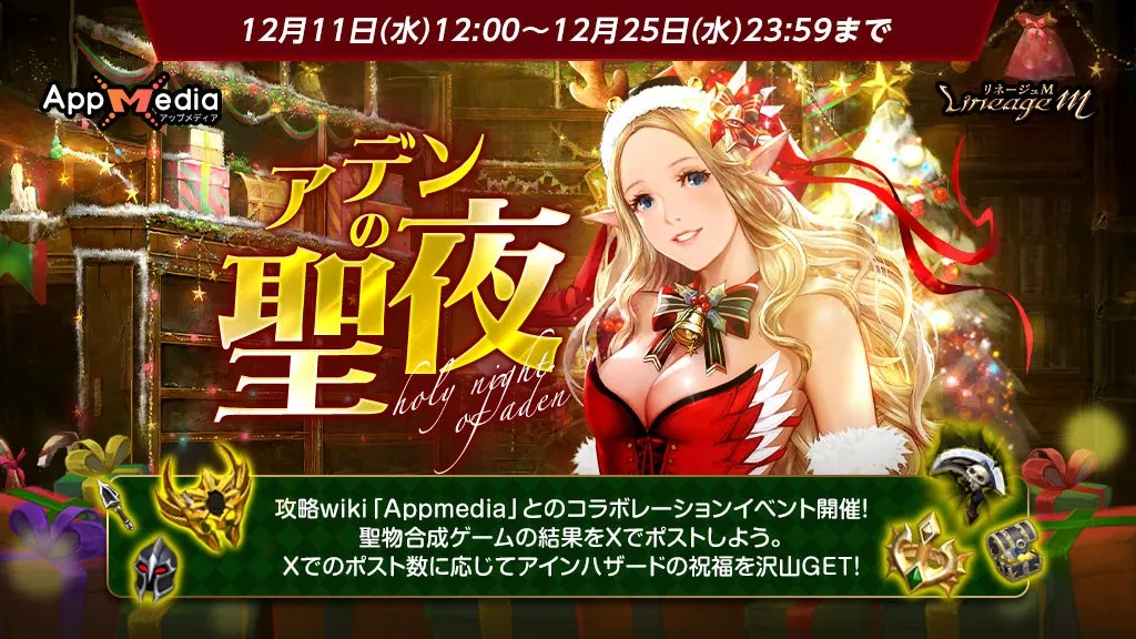 このクリスマスイベントは、攻略wikiメディア「AppMedia」とのコラボレーションによって実現しました。「アデンの聖夜」では、プレイヤーは聖物合成ゲームに挑戦し、特別な聖物「アインハザードの現身」の合成を目指します。ゲーム内では、合成結果に基づいて喜ばしい報酬として「アインハザードの祝福」を手に入れるチャンスがあり、さらに、結果をSNSにシェアしたプレイヤーの中から抽選で英雄級聖物カード「[聖物カード]タロスの槍」が贈られるチャンスも!