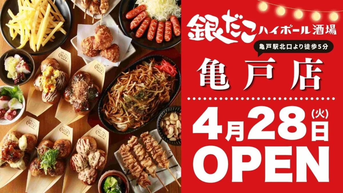 2026年4月28日、東京都江東区の亀戸に新たに『銀だこハイボール酒場 亀戸店』がオープンします。築地銀だこを展開するホットランドホールディングスの子会社が提供するこの酒場は、亀戸駅北口から徒歩約5分の距離、賑やかな亀戸十三間通商店街内に位置しています。周囲には歴史的なスポットも多く、観光客のみならず地元住民にも親しまれる立地です。