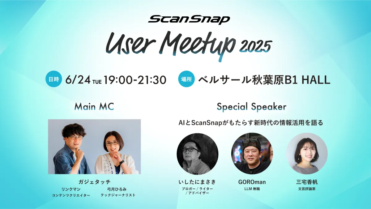 株式会社PFUによるイメージスキャナー「ScanSnap」が、2025年6月24日火曜日に秋葉原にて「ScanSnapユーザーミートアップ2025」を開催します。このイベントは、過去7年間にわたり実施されていなかったため、参加者にとって非常に特別な機会となるでしょう。