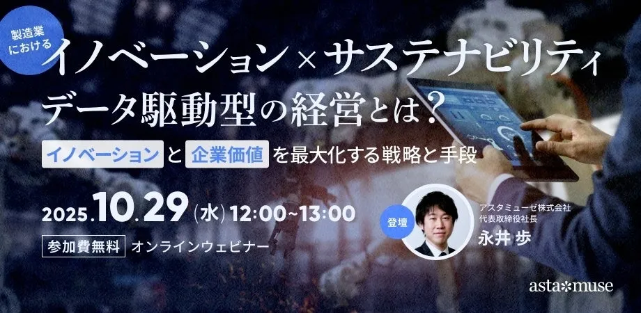 アスタミューゼ株式会社は、2025年10月29日(水)に「製造業における『イノベーションxサステナビリティ』データ駆動型の経営とは?」というテーマで無料ウェビナーを再開催します。このウェビナーでは、経営者や新規事業担当者に向けて、急速に変化する社会や業界に対応するための最新の経営意思決定手法が紹介されます。