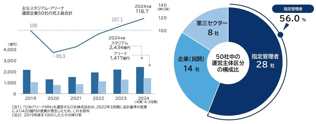 2024年度、国内のスタジアム及びアリーナ施設の運営を行う主要企業50社の売上高が合計で3851億円に達しました。この数値は、新型コロナウイルスの影響を受ける前の2019年度に比べて18%の増加を記録し、音楽ライブの再開やプロスポーツの観客動員数の回復が影響しています。この成長は地域のアリーナ開発にも寄与しており、Bリーグの増加による新設や改修が後押ししています。