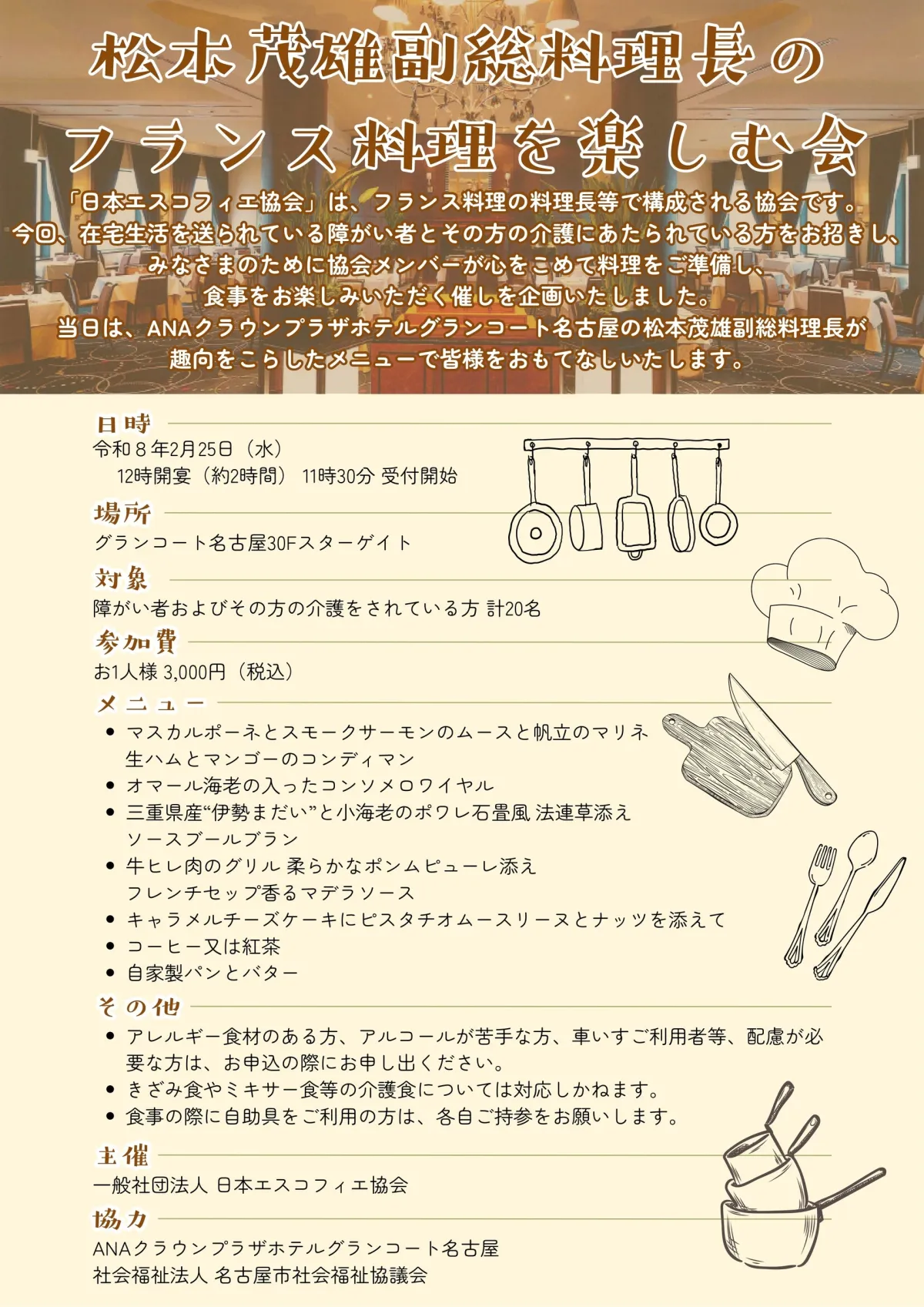 名古屋市で、社会福祉法人名古屋市社会福祉協議会の主催による特別なイベントが開催されます。これは、一般社団法人日本エスコフィエ協会の協力を得て、障害者団体を対象にした「フランス料理社会福祉食事会」です。過去に全国各地で継続的に行われてきたこのイベントは、名古屋では今回で4回目を迎えます。