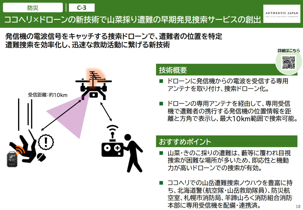 掲載された「ほっかいどうDX促進事業ソリューションマップ(令和7年12月版)」には、ココヘリの「ココヘリ×ドローンの新技術で山菜採り遭難の早期発見捜索サービス」が紹介されています。この技術では、遭難者が持つ発信機が発する電波をドローンによって受信し、その信号を「距離と方角」で把握する仕組みです。最大約10kmの範囲まで捜索可能であり、藪に覆われた場所でも目視捜索が困難な状況下で力を発揮します。