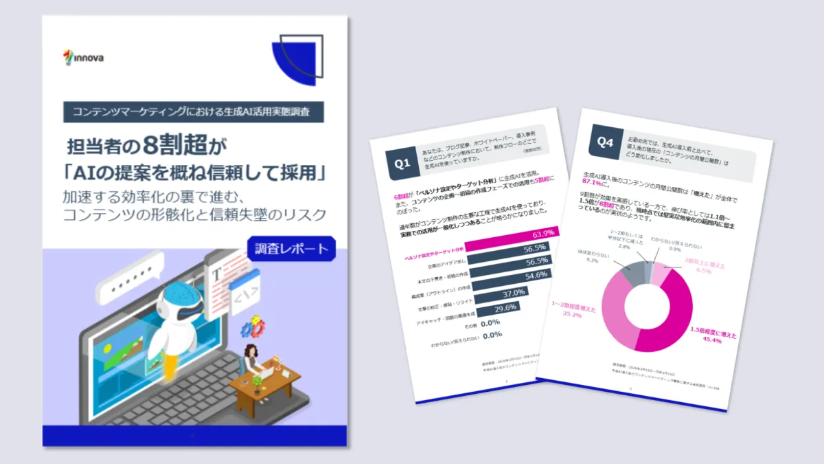 株式会社イノーバが、生成AIを用いるコンテンツ制作を行っているマーケティング担当者108名を対象にした調査を発表しました。この調査からは、生成AIの導入が大きな影響を及ぼしつつある現状が浮き彫りになっています。特に興味深いのは、コンテンツの公開数が87.1%のマーケティング担当者によって「増えた」との回答を得たことです。それに伴い、導入後の業務プロセスにも変化が生じていることが分かります。