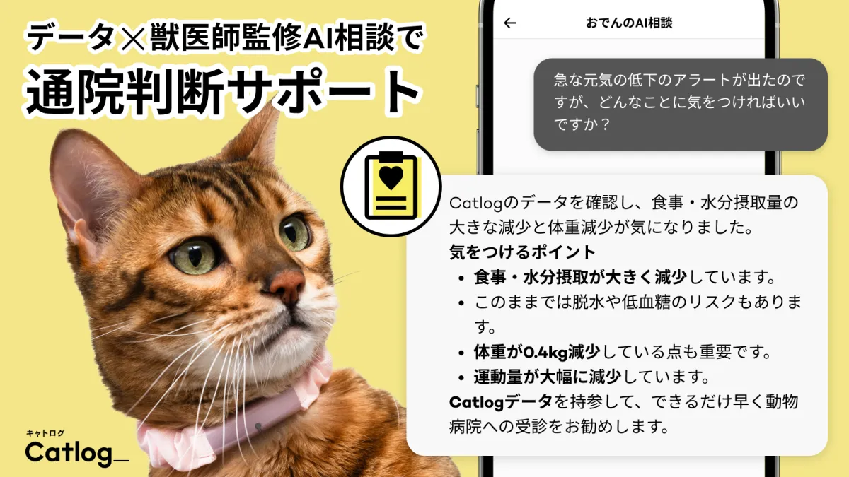 猫の健康状態は、ちょっとした変化が後に大きな問題につながることがあります。たとえば、急に元気がなくなったり、食欲が落ちたりした場合、飼い主はどうしたら良いのか迷いますよね。『Catlog』のAI相談機能は、日々のデータを活用してこのような際にサポートを提供します。