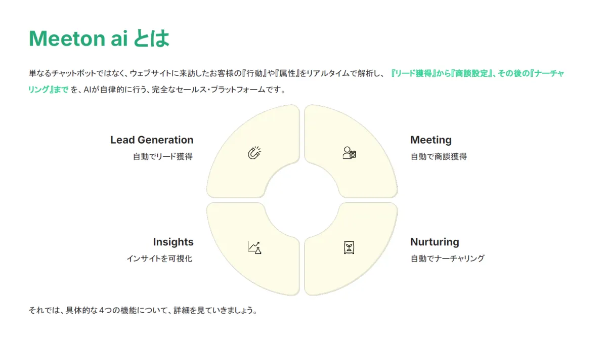 Dynameetが提供する「Meeton AI」は、Webサイトから自動的に商談を創出するAIセールスプラットフォームです。Web訪問者の行動をリアルタイムで解析し、リード獲得から商談設定までを自動化します。このシステムのおかげで、多くのBtoB企業が見逃していた顧客接点を有効に活用し、商談機会を増やすことが可能になります。
