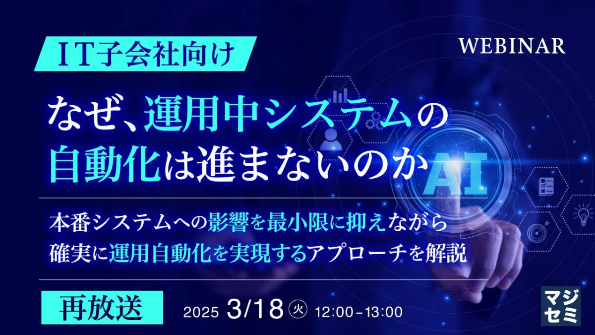 2025年に向け、IT子会社が直面する課題の一つが運用自動化です。その背景には、慢性的なIT人材不足とシステムの複雑化が挙げられます。多くの企業がこのトピックを重要視しているため、再放送される特別ウェビナーでは、運用自動化のステップを詳しく解説します。