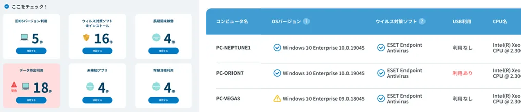 企業が保持するすべてのIT資産やリスクを一元管理できるダッシュボードを搭載しています。これにより、セキュリティインシデントを早期に発見し、迅速に対応することが可能です。