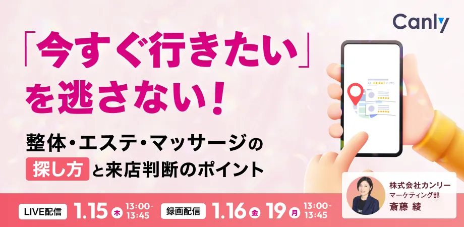 本セミナーでは、整体、エステ、マッサージの各店舗を探すための方法と、その際にどの情報が来店判断に影響を及ぼすのかについて整理していきます。この情報をもとに、参加者は日常の店舗運営の見直しや、効果的な情報発信のヒントを得ることができます。