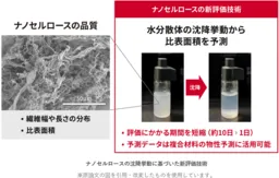 研究チームは、ナノセルロースの形状情報を正確に反映した比表面積を予測するためのモデルを構築しました。このモデルは、ナノセルロースの沈降挙動をヒートマップ形式で視覚化し、そのデータを使って人工知能(AI)で解析する仕組みです。この方法により、従来の約10日間から、わずか1日で高精度な比較が可能になりました。