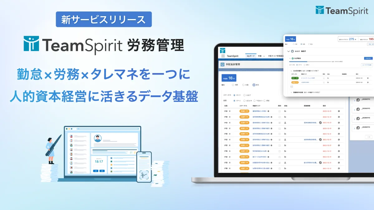 株式会社チームスピリット(東京都千代田区、CEO:道下和良)は、人的資本の生産性を最大化する統合型クラウドサービス「Team Success Platform」をベースにした新しい労務管理システム「TeamSpirit 労務管理」をリリースしました。このサービスは、勤怠・工数・経費・タレントマネジメントの各要素に加え、労務管理を統合することにより、人事業務の大幅な効率化とデータ活用の革新を目指します。