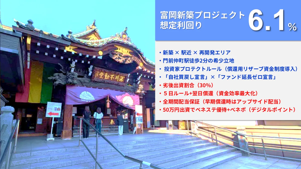 2023年9月16日から、注目の新ファンド『らくたま27号(富岡新築プロジェクト)』の募集が始まりました。今回のファンドは、全期間配当保証や翌日償還、優先劣後システムなど高機能な設計を採用しており、資金効率を最大化しつつ、投資の安定性を追求しています。