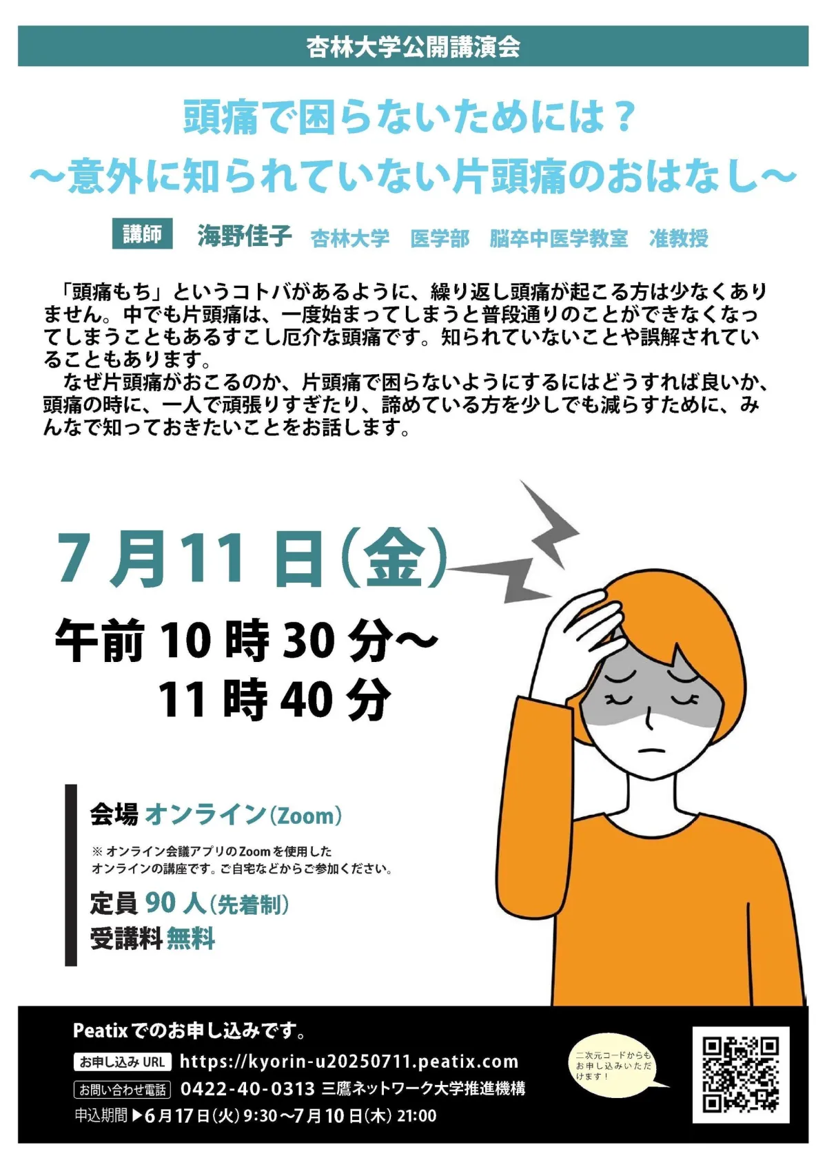 東京都三鷹市に位置する杏林大学では、2025年7月11日(金)に「頭痛で困らないためには?~意外に知られていない片頭痛のおはなし~」というオンライン講座を開催します。この講座では、医学部の海野佳子准教授が片頭痛に関する重要な情報を提供します。