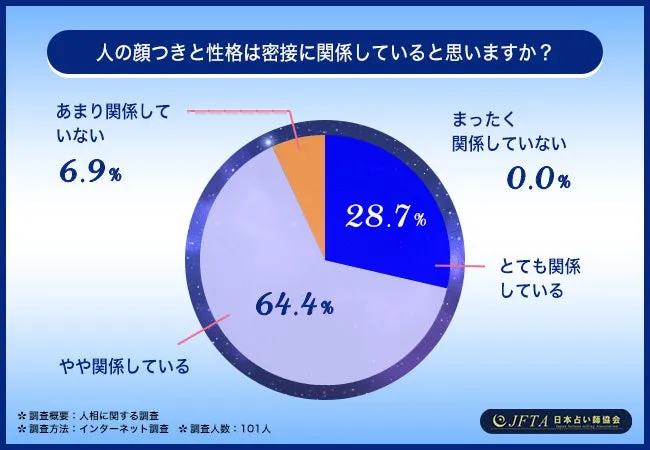 調査では、「人の顔つきと性格は密接に関係していると思いますか?」という質問に対し、64.4%が「やや関係している」、28.7%が「とても関係している」と回答しました。これにより、93.1%の人々が顔と性格に何らかの関連性を認識していることが明らかになりました。逆に、「あまり関係していない」と感じる人は6.9%と少数派で、まったく関係がないと考える人はいませんでした。