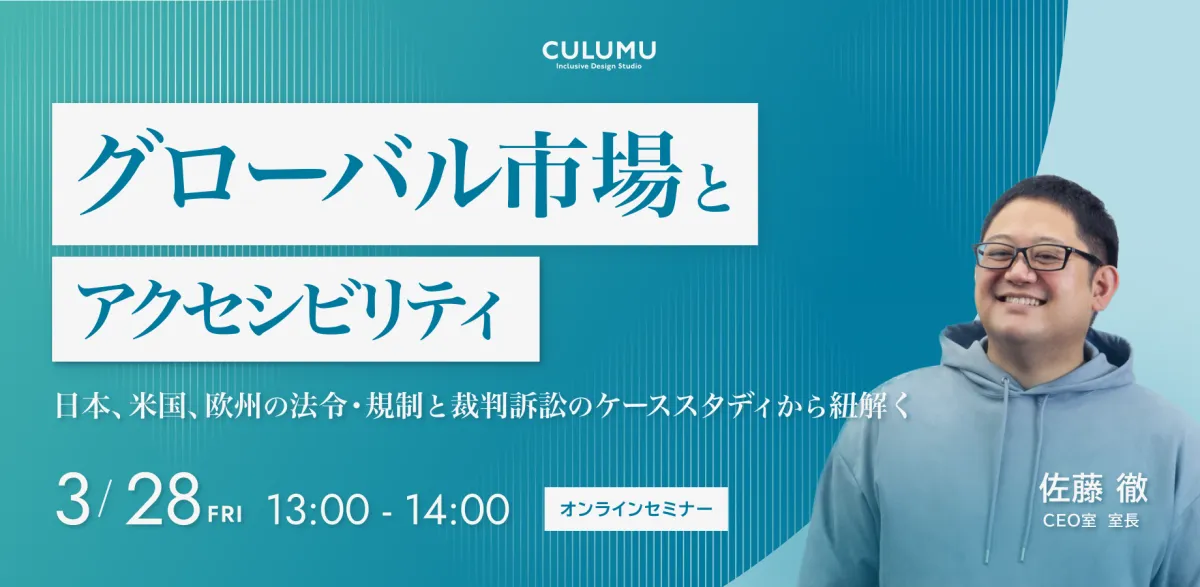 開催日時は2025年3月28日(金)13:00から14:00まで、形式はオンライン(Zoom)で行われ、参加は無料です。主催は株式会社STYZのインクルーシブデザインスタジオCULUMUであり、法令や規制について、さまざまな国の視点から深堀りする内容が予定されています。具体的には、日本の障害者差別解消法やJIS X 8341-3、米国のADAやWCAG 2.2、そして欧州のアクセシビリティ法についての要点と、その影響についての解説が行われます。