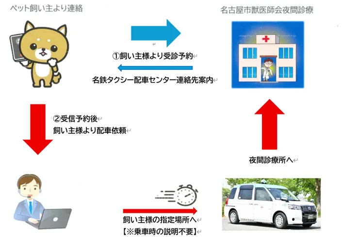 - - 利用方法: まずは「夜間動物救急センター」に問い合わせて診療の受け入れを確認後、配車センター(名古屋0570-085255、尾張地区0586-73-5166)に連絡します。詳細はこちらのリンクをご覧ください。