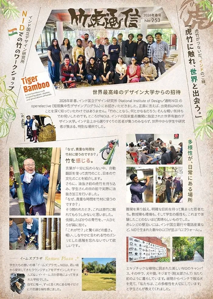 竹虎は創業1894年以来、日本の竹材製品を世に広めてきた企業です。この度、竹虎の四代目がインド国立デザイン研究所(NID)で行った竹に関するワークショップの体験を紹介します。2026年春号の「竹虎通信」では、この貴重な経験が特集されています。