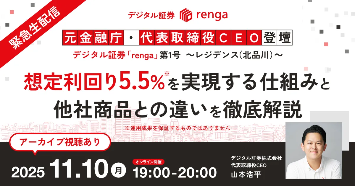 11月10日(月)、デジタル証券「renga」の第1号案件、北品川のレジデンスに関するウェビナーが開催されます。このウェビナーでは、想定利回り年5.5%をいかに実現しているのか、具体的な収益構造や運用設計について詳しく解説されます。