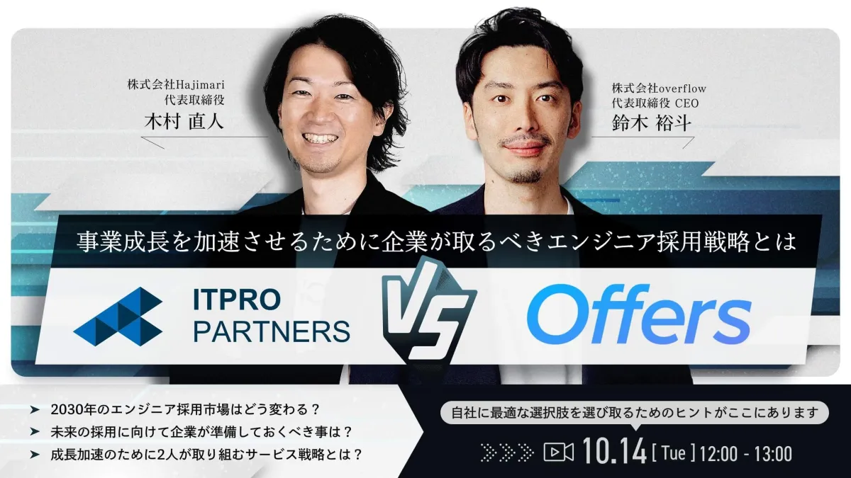 2023年10月14日、ハイクラスエンジニア採用プラットフォーム「Offers」を運営する株式会社overflowが主催するセミナーが開催されます。このオンラインイベントは、「事業成長を加速させるために企業が取るべきエンジニア採用戦略とは【ITプロパートナーズ VS Offers】」というテーマで、業界を牽引する二つの企業のトップが集まり、採用戦略についてディスカッションします。