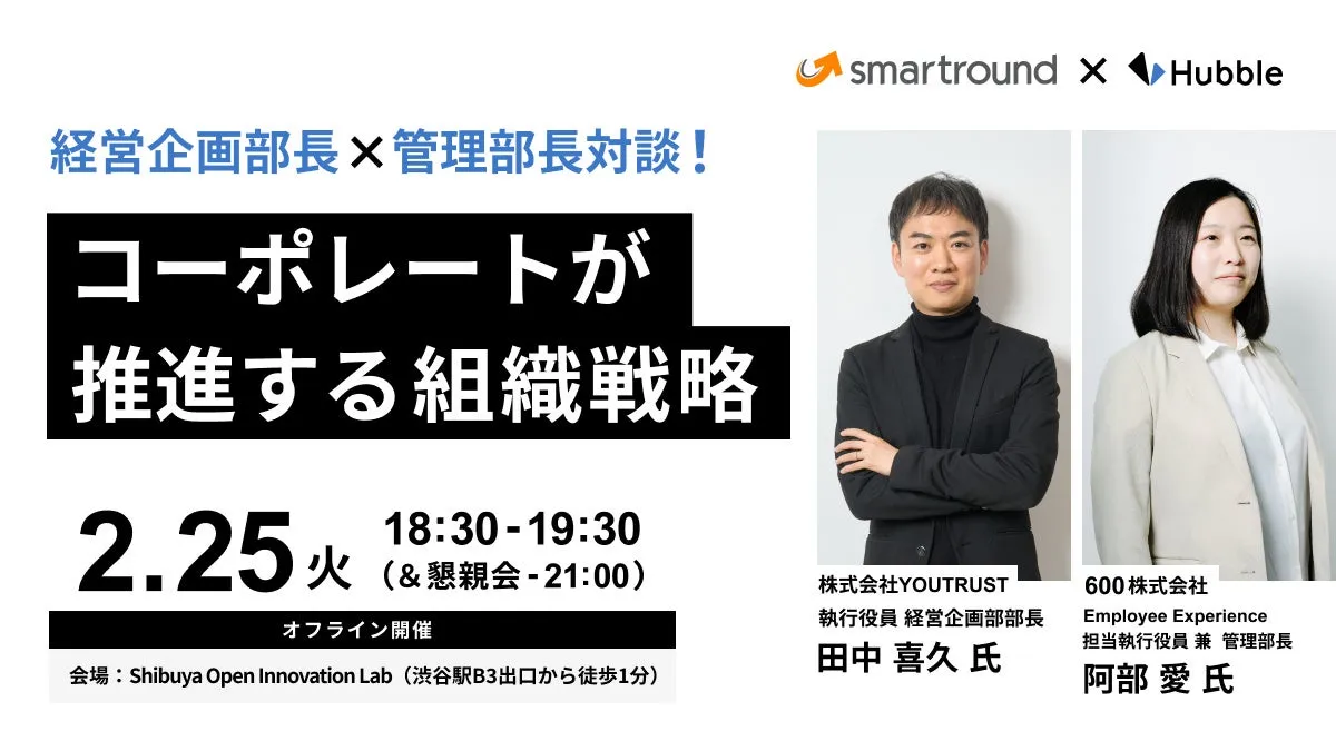 株式会社Hubbleは、2025年2月25日(火)に特別イベントを開催します。このイベントは「経営企画部長×管理部長対談!コーポレートが推進する組織戦略」というテーマで、急成長するスタートアップ企業の経営者や管理部門の方々を対象としています。イベントには、株式会社YOUTRUSTの経営企画部部長である田中喜久氏と、600株式会社のEmployee Experience担当執行役員・管理部長の阿部愛氏をお招きし、彼らの経験や戦略を共有していただきます。