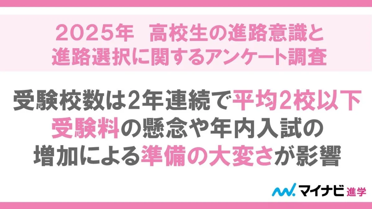 受験校の選択については、平均で1.94校という数値が示され、過去2年連続で2校を下回る結果となりました。この背景には、受験校を増やすことによる費用の負担や準備の大変さが影響しており、33.2%の高校生が受験校数を絞る理由として「受験料や入学金の支払いが大変である」ことを挙げています。