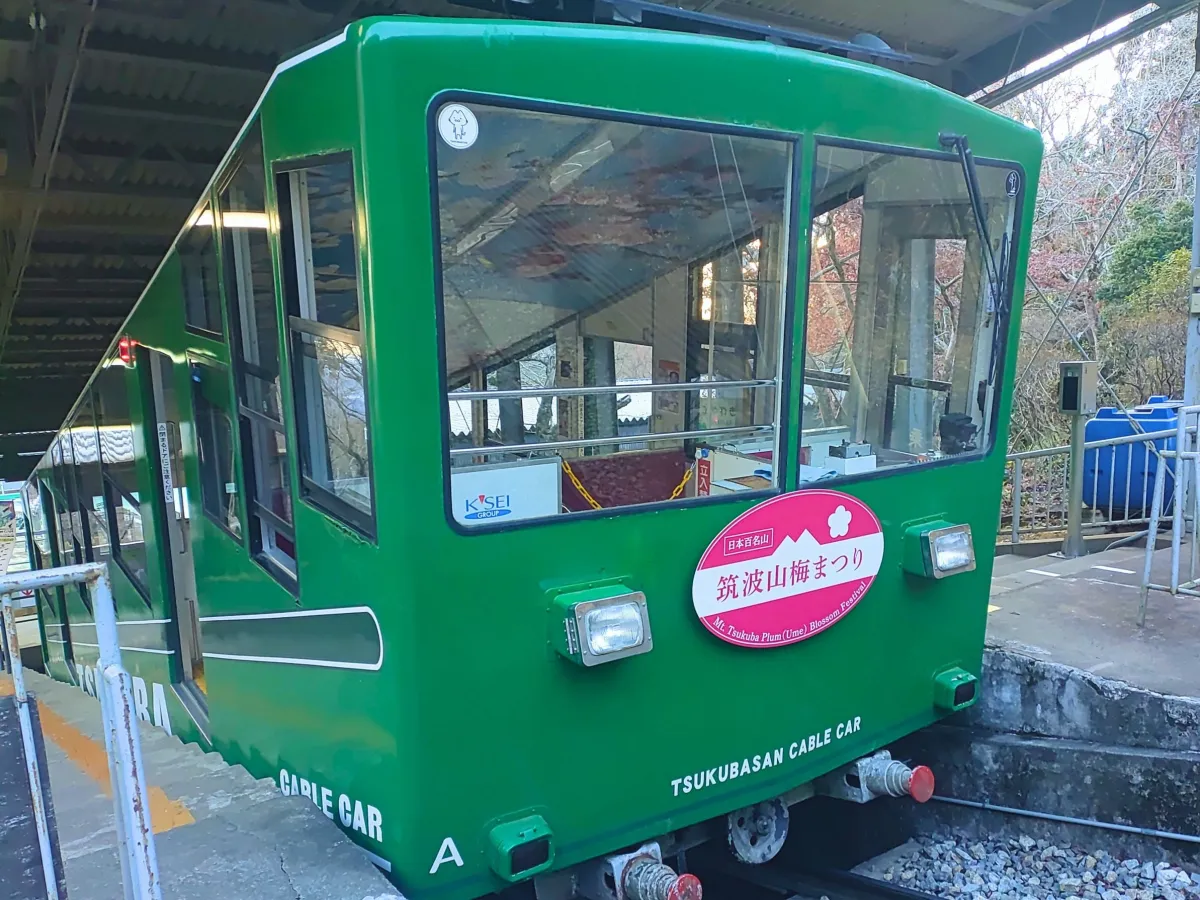 ケーブルカーの前部分に飾られるヘッドマークが、梅まつり特別デザインに変わります。緑色・赤色の両車両とも、この特別デザインを楽しむことができます。