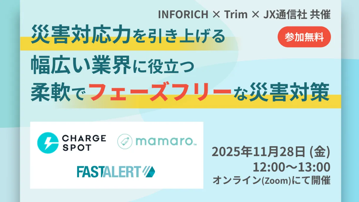 2025年11月28日、株式会社JX通信社、株式会社INFORICH、Trim株式会社が共催する「災害対応力を引き上げる 幅広い業界に役立つ柔軟でフェーズフリーな災害対策」と題したウェビナーが開催されます。今回のセミナーは、過去の災害を教訓に、企業が求められる「高い災害対応力」について深く掘り下げる内容となっています。