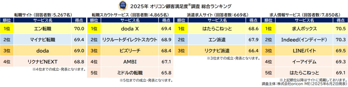 2025年6月2日、オリコン株式会社が実施した顧客満足度調査の結果、転職サイトや派遣求人サイトのランキングが発表されました。特に「エン転職」が8年連続で転職サイト総合1位を獲得したことが注目されています。以下では、具体的な調査結果と利用者の声を紹介します。