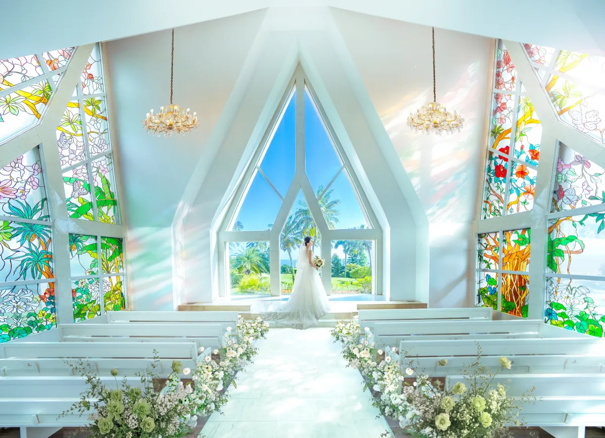リニューアル後の「アラマンダ チャペル」は、「静かに、満ちる。」という新しいテーマで生まれ変わります。チャペル内の装飾は、ウェディングロードとの調和を考えられたデザインが施され、宮古島の植物をモチーフにした美しいステンドグラスが、思い出の瞬間を引き立てます。ホワイトとグリーンを基調にした洗練されたインテリアが、リゾートの雄大な自然と共鳴し、心温まる挙式を実現します。