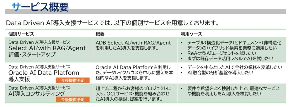 「Data Driven AI導入支援サービス」では、顧客のビジョンや戦略に基づいてOCIの機能を適切に組み合わせたAI導入を支援します。長年の経験に裏打ちされた実績を基に、OracleのAI DatabaseおよびOCI関連サービスを効果的に活用し、より価値のあるインサイトを提供します。このサービスは、データの集約から分析、意思決定までのプロセスを慎重に設計されており、安全かつ効率的なAIシステムの導入を実現します。