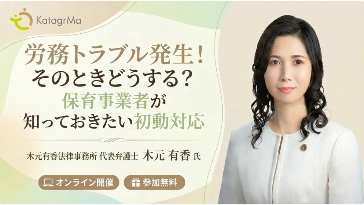 保育事業者を対象としたオンラインセミナー「労務トラブル発生!そのときどうする?保育事業者が知っておきたい初動対応」が、2026年2月17日(火)と18日(水)に開催されます。このセミナーでは、法律に精通した弁護士、木元有香氏が講師として登壇し、労務トラブルの具体的な初動対応について解説します。
