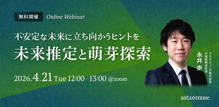 アスタミューゼ株式会社は、2026年4月21日(火)12:00から13:00にかけて、私たちの未来に関する重要なテーマを扱う無料ウェビナー「不安定な未来に立ち向かうヒントを ~未来推定と萌芽探索~」を再び開催します。このイベントでは、ビジネスの現場で役立つ正しい未来予測の方法について深く探求します。