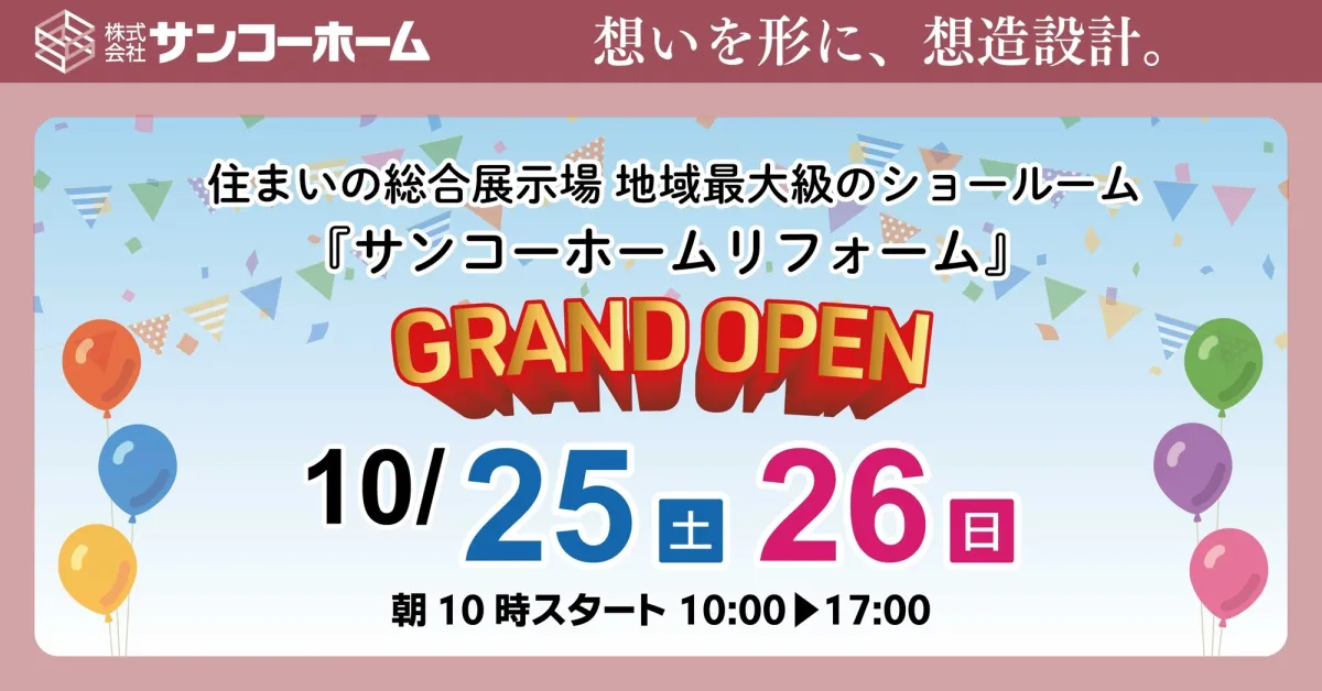 株式会社サンコーホームが、2025年10月25日(土)に秋田市東通に新たな体感型リフォームショールーム『サンコーホームリフォーム』をオープンすることを発表しました。この県内最大級のショールームでは、リフォームに必要な空間を実際に体験できる環境が整っています。