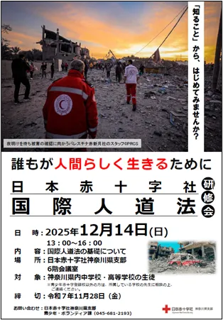 日本赤十字社神奈川県支部が主催する「国際人道法研修会(IHL)」が、2025年12月14日(日)、横浜市にて開催されます。この研修会は、中学校や高校に通う生徒たちを対象に、戦争や平和の重要性、そして人の命や尊厳について国際人道法の視点から指導するプログラムです。